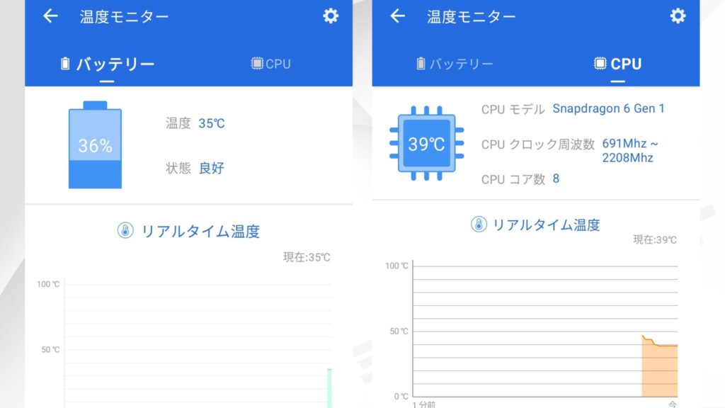 発熱も抑制されており、バッテリー温度35°、CPU39°と安定した動作を確認できた。ミドルレンジとしては十分な性能を提供している。