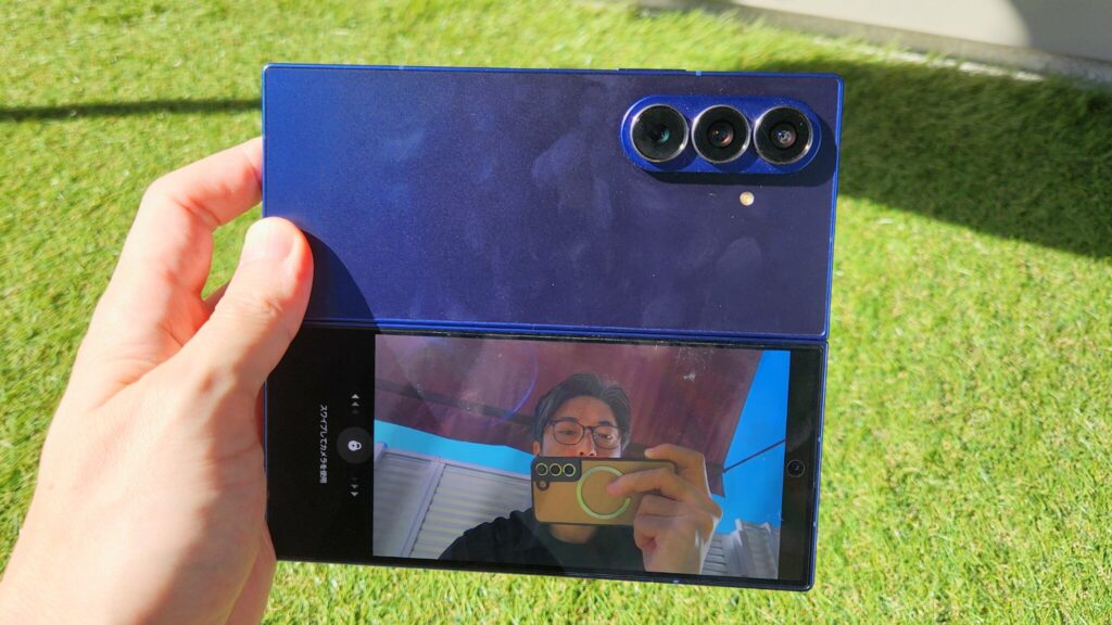 折りたたんでカバー画面を見ながら背面カメラで自撮りができるのは、Galaxy Z Fold 7ならではの体験。インカメラよりも高画質な自撮りが可能だ。